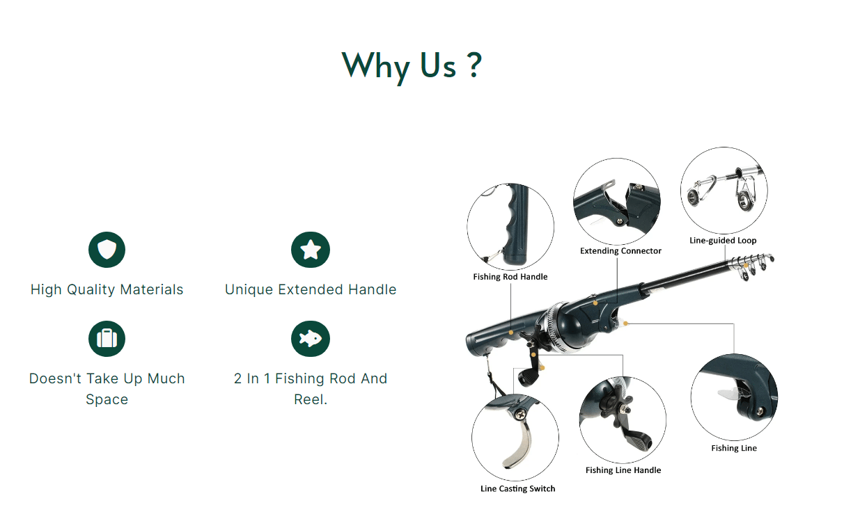 Starts with our amazing folding fishing rod! This compact wonder tool is perfect for professionals and novice anglers alike. Light in weight, it is perfect for long hikes and ready to be your trusted companion in the world of fishing.